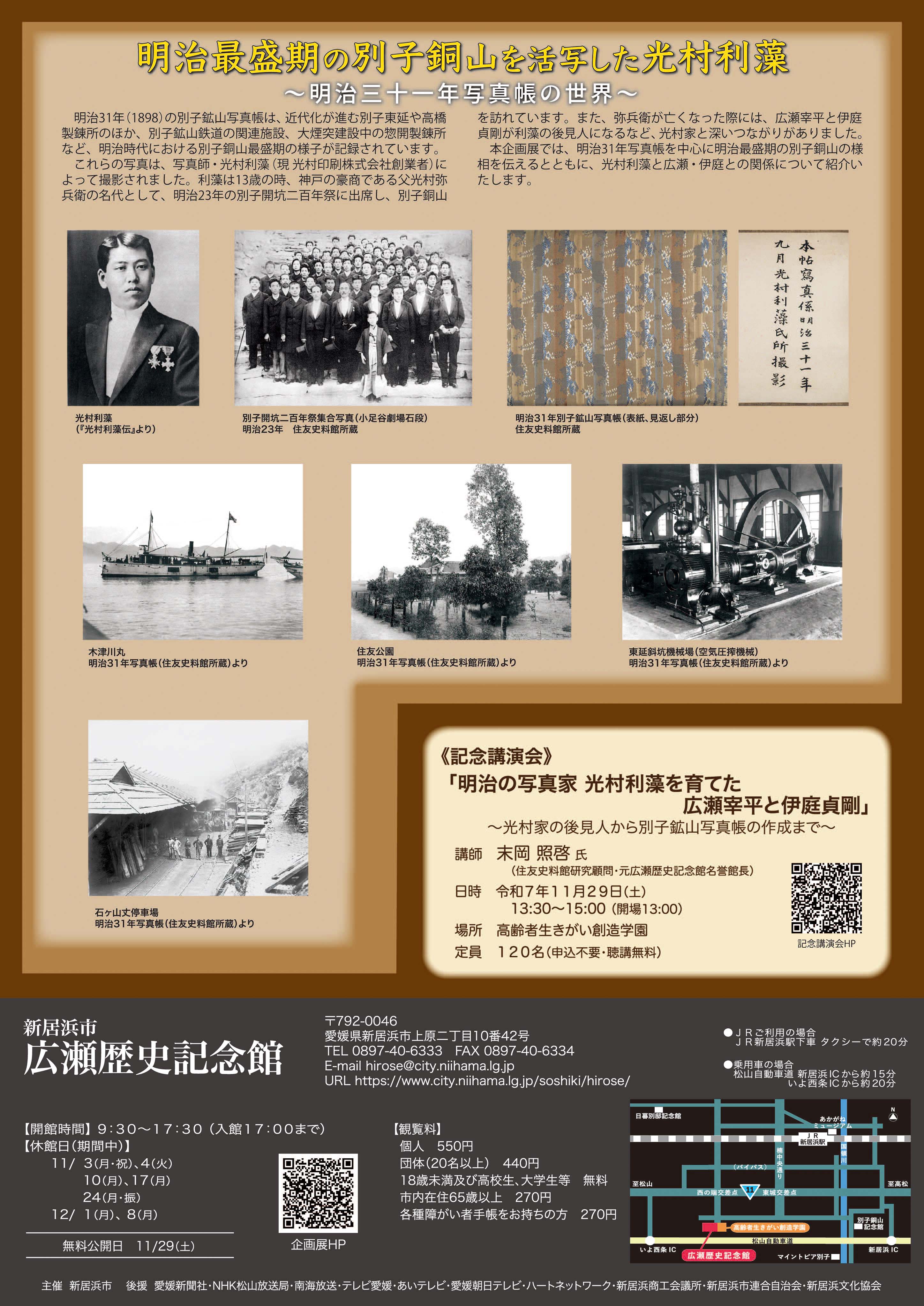 - Special Exhibition at the Hirose Historical Museum in 2025: "Mitsumura Toshimo, who vividly depicted the Besshi Copper Mine at its peak in the Meiji era: The world of the Meiji 31 photo album"