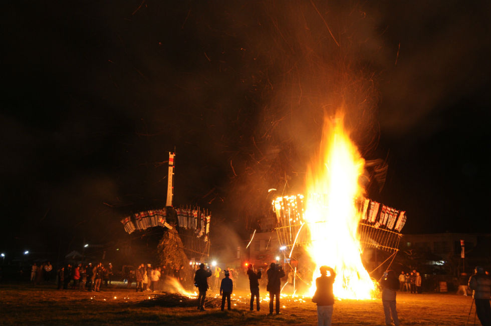 On the 3rd of the New Year, village boys gather together kadomatsu, bamboo grass, and shimenawa straw ropes to make large 12-meter-tall “toudo”, two large and one small in each district. And around 3:00 am on Coming-of-Age Day, the five districts compete to light a fire.